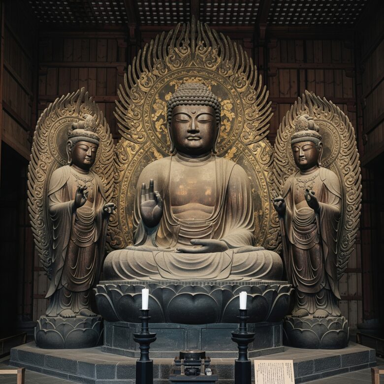 中央の釈迦如来と、その両脇に立つ菩薩。三体が放つ静かなハーモニーは、見る者の心を穏やかにします。 この様式は「止利式(とりしき)」と呼ばれ、日本の仏像彫刻の確かな礎となりました。